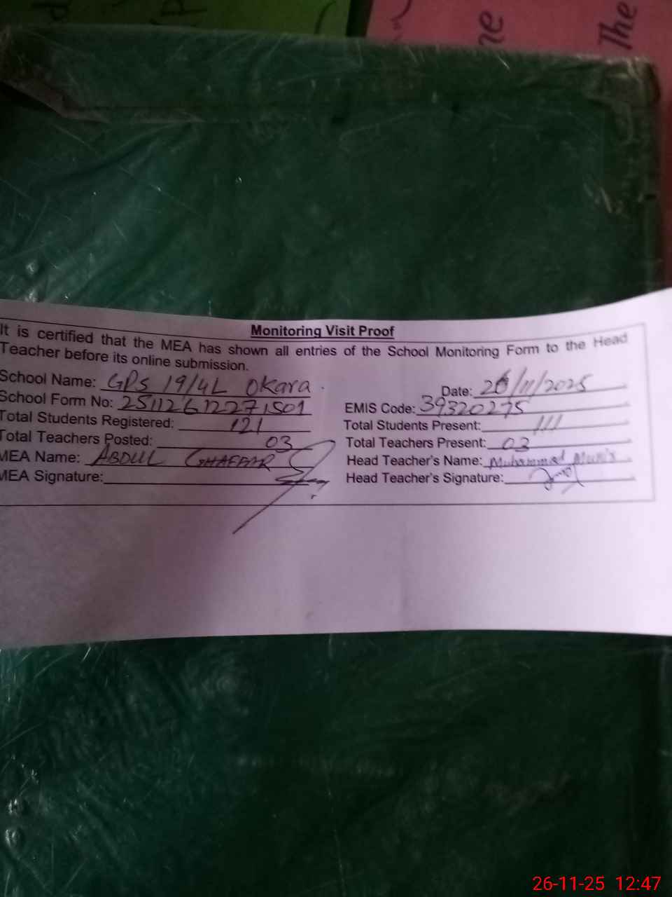 | Attendance Register | Head Teacher | MEA with School | Visit Proof |