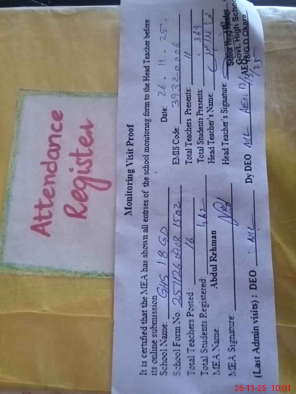 | EMIS Code: 39320006 | Name of School: GHS CHAK NO. 18/G.D | |||