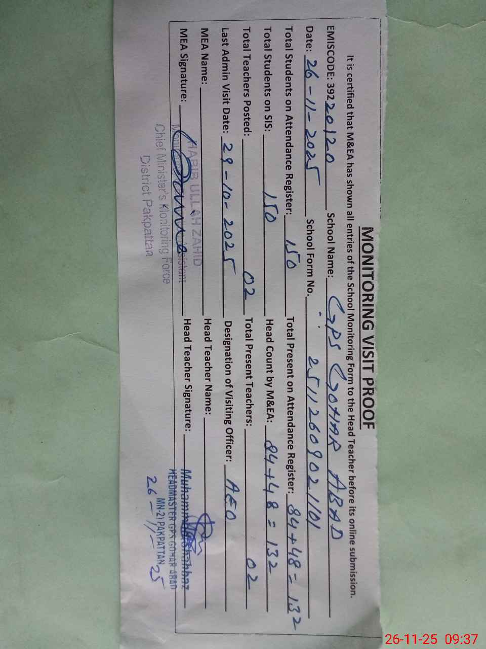 | Attendance Register | Head Teacher | MEA with School | Visit Proof |
