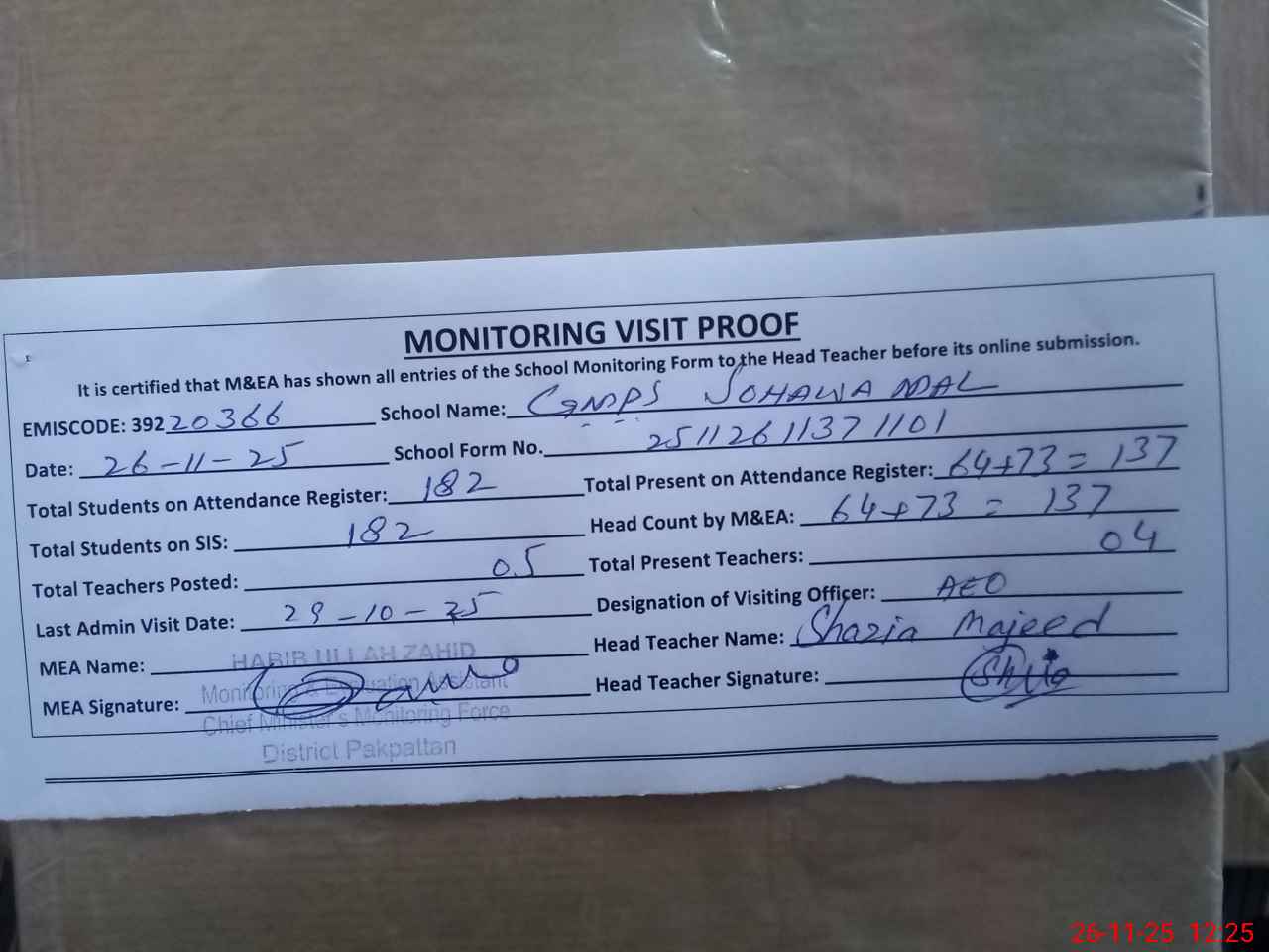 | Attendance Register | Head Teacher | MEA with School | Visit Proof |