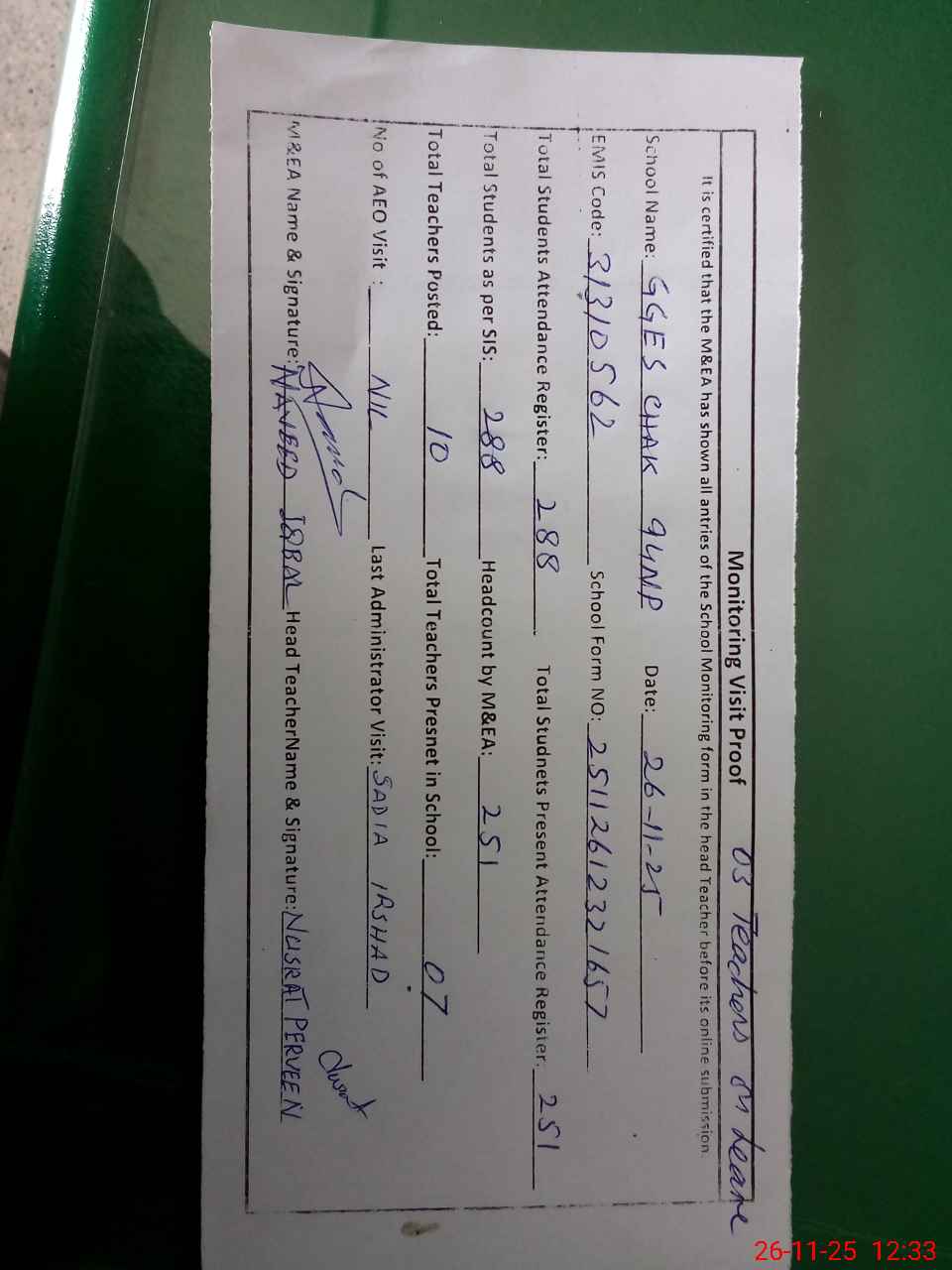| Attendance Register | Head Teacher | MEA with School | Visit Proof |