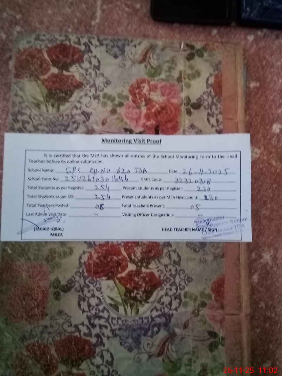 | Attendance Register | Head Teacher | MEA with School | Visit Proof |