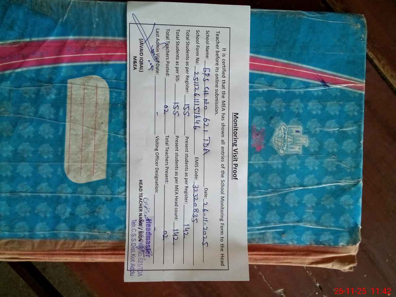 | Attendance Register | Head Teacher | MEA with School | Visit Proof |