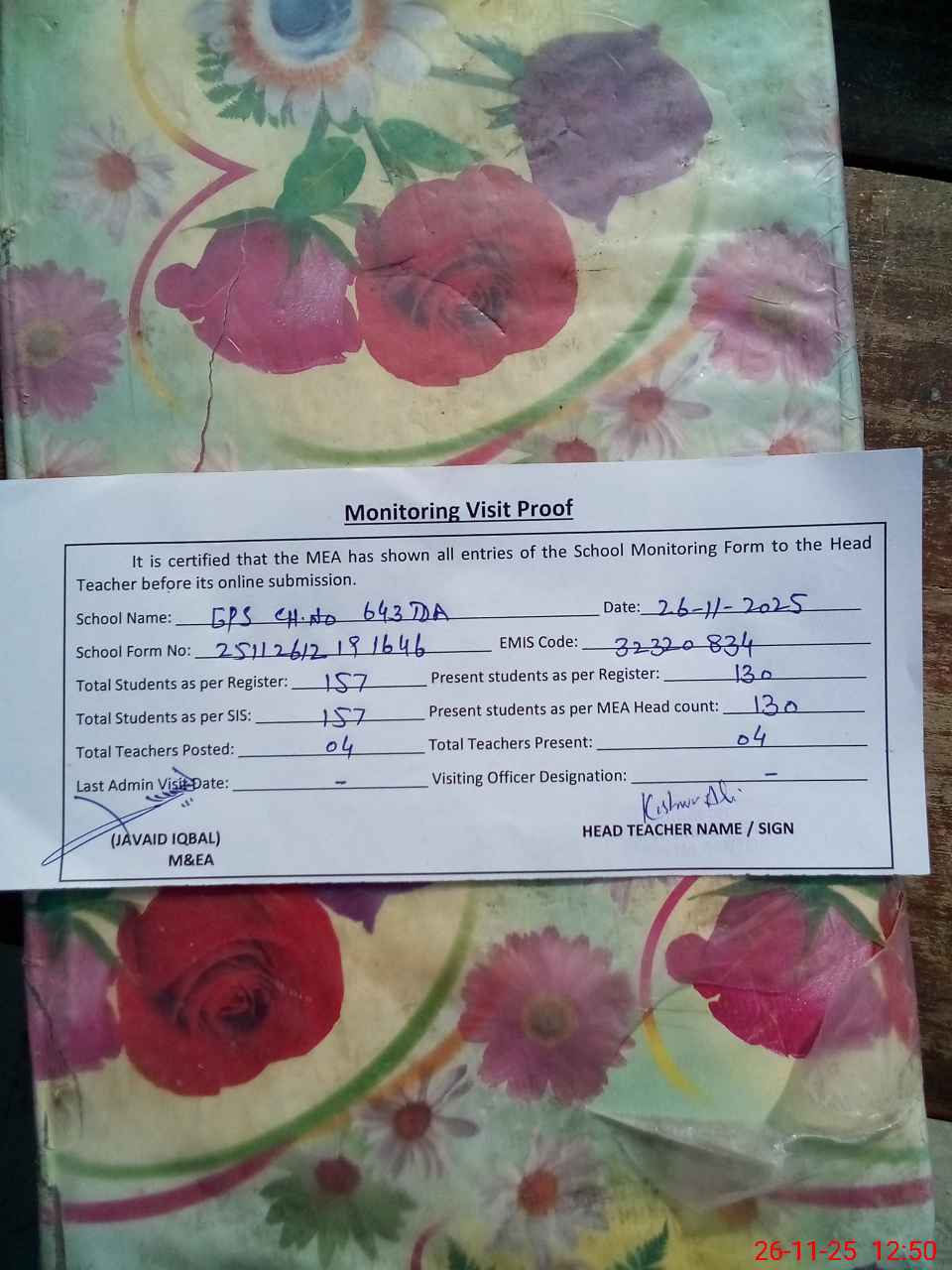 | EMIS Code: 32320834 | Name of School: GPS CHAK NO.643/TDA | |||