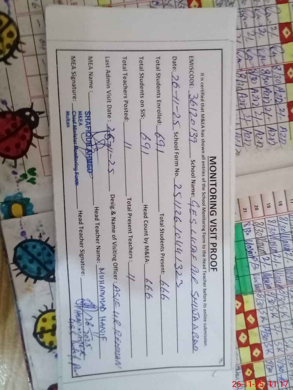 | Attendance Register | Head Teacher | MEA with School | Visit Proof |