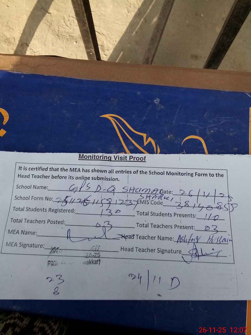 | Remarks (Use Separate Page if Required): Shahzad Fazal Dy DEO 24 Nov 2025 | |||||