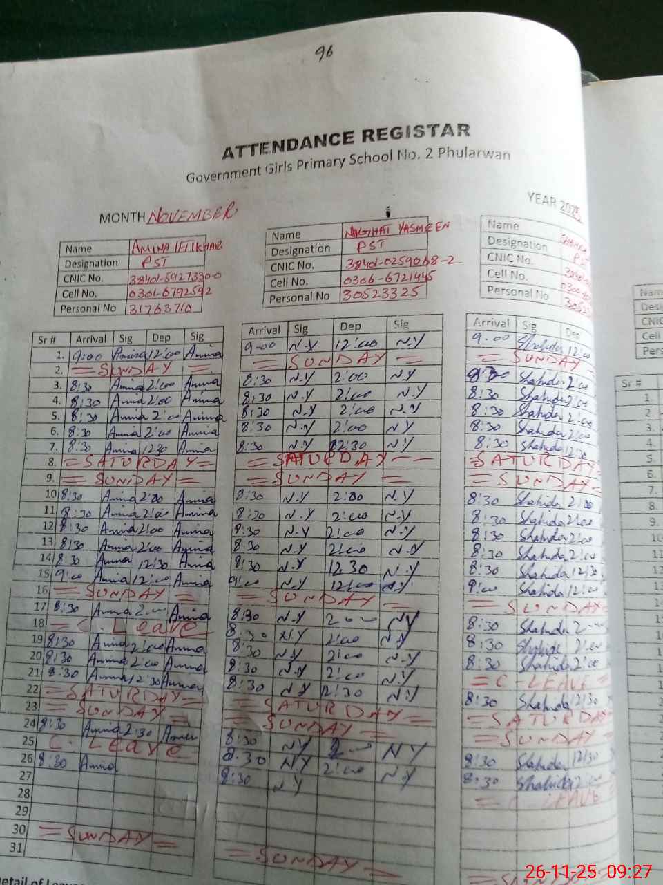 | CNIC | Full Name | Designation | R/C | Absence During Last Calender Month |