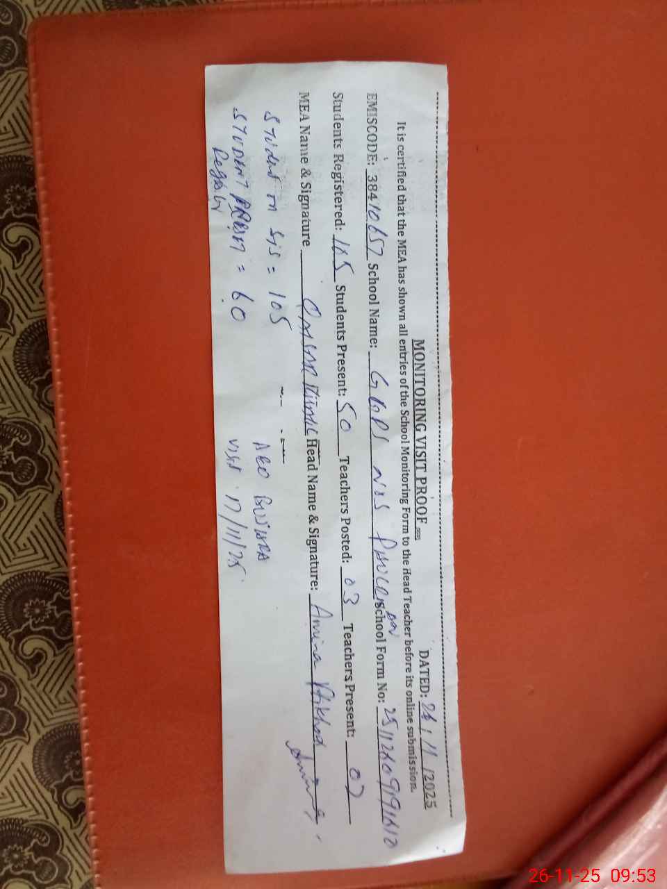 | Certified that this School was Inspected by the Undersigned MEA/DMO Today and the Information Stated Above is as Per Record. | |||||