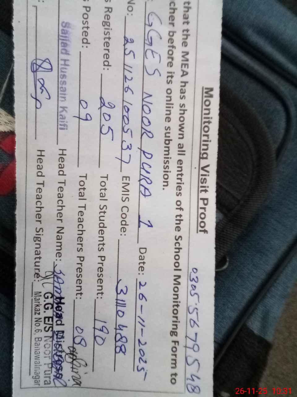 | Attendance Register | Head Teacher | MEA with School | Visit Proof |