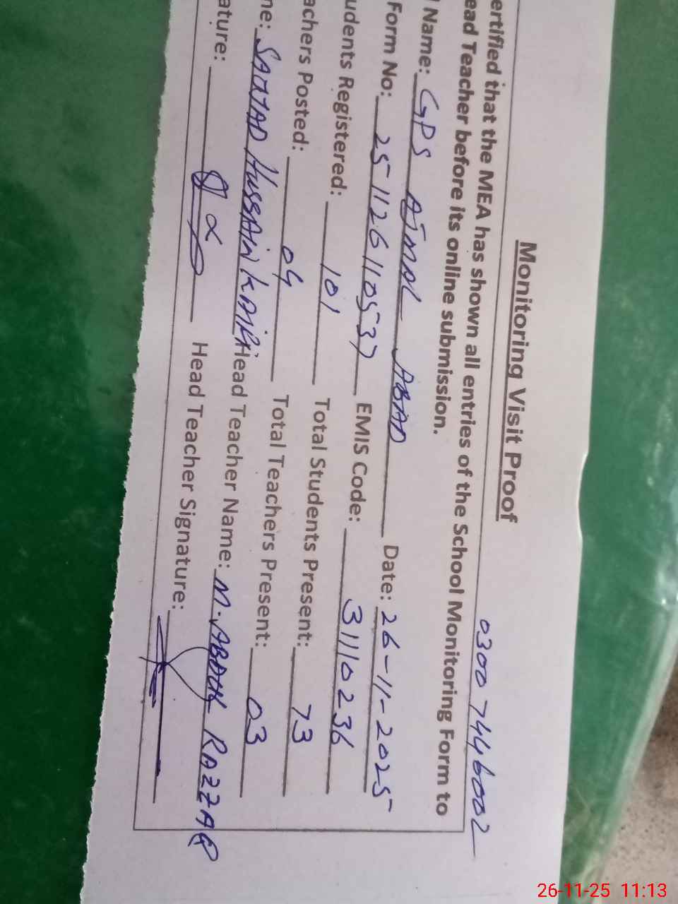 | EMIS Code: 31110236 | Name of School: GPS AJMAL ABAD (BASTI HAZOORA) | |||