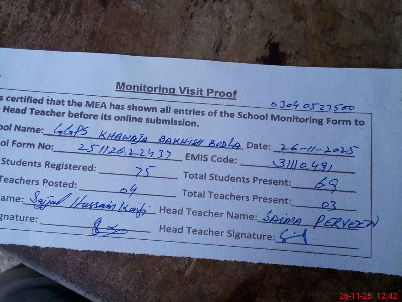 | EMIS Code: 31110491 | Name of School: GGPS KHAWAJA BUKHSH BODLA | |||