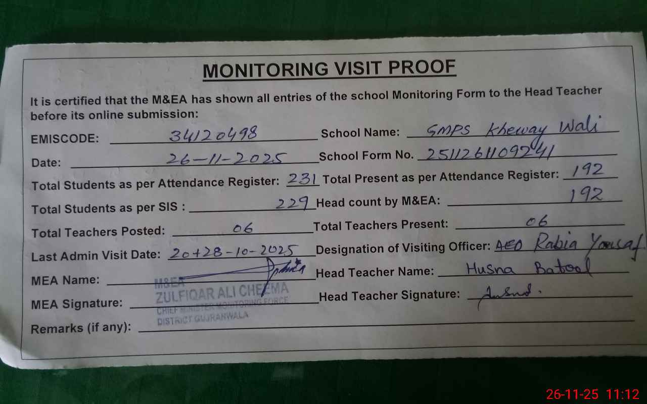 | EMIS Code: 34120498 | Name of School: GMPS KHEWAY WALI | |||