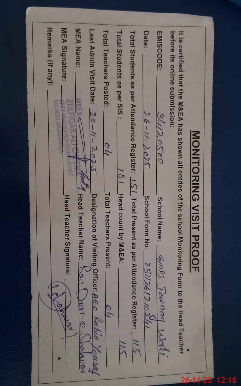 | EMIS Code: 34120500 | Name of School: GMPS JEWANY WALI | |||