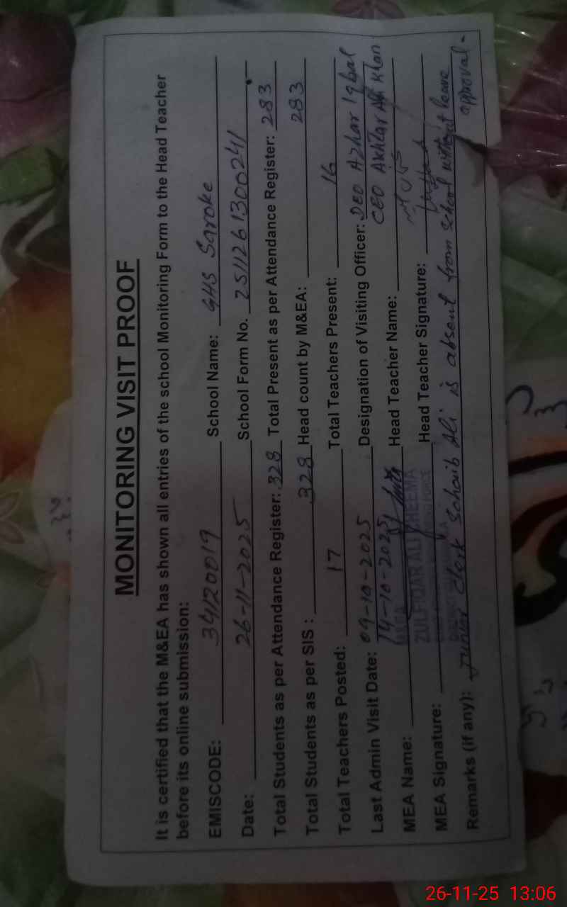 | Attendance Register | Head Teacher | MEA with School | Visit Proof |