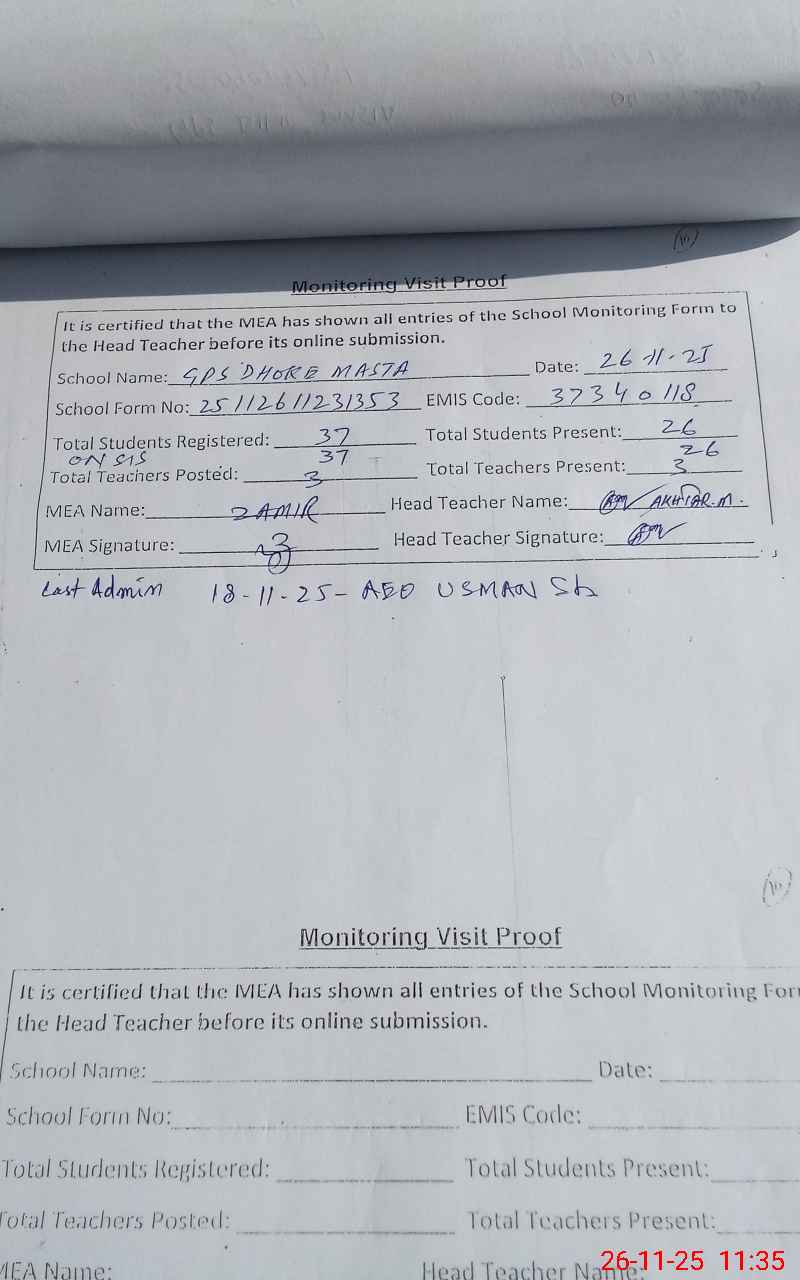 | Attendance Register | Head Teacher | MEA with School | Visit Proof |