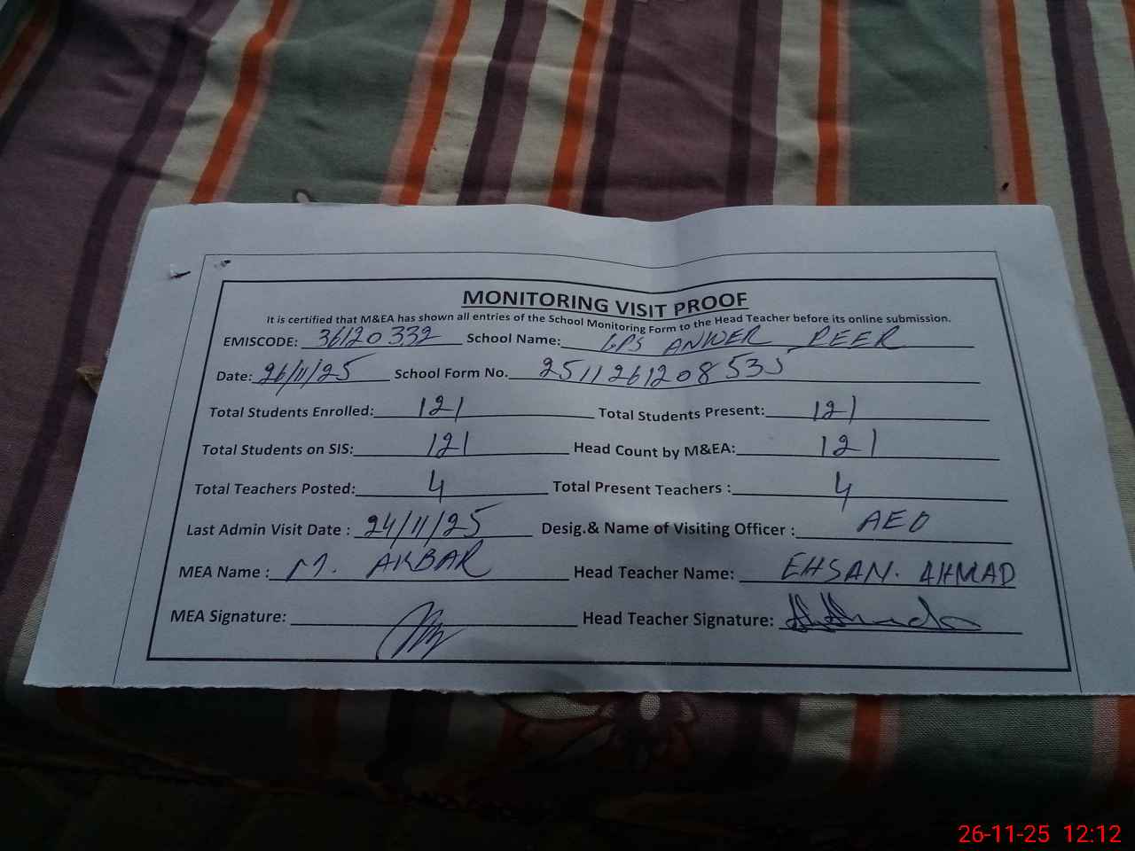 | EMIS Code: 36120332 | Name of School: GPS ANWAR PEER SHUJABAD | |||