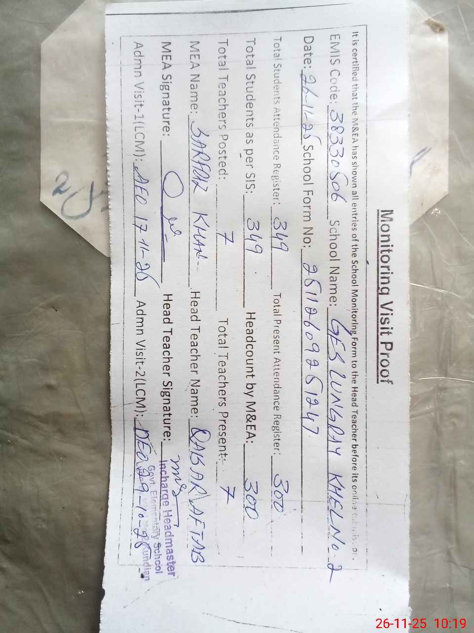 | Attendance Register | Head Teacher | MEA with School | Visit Proof |