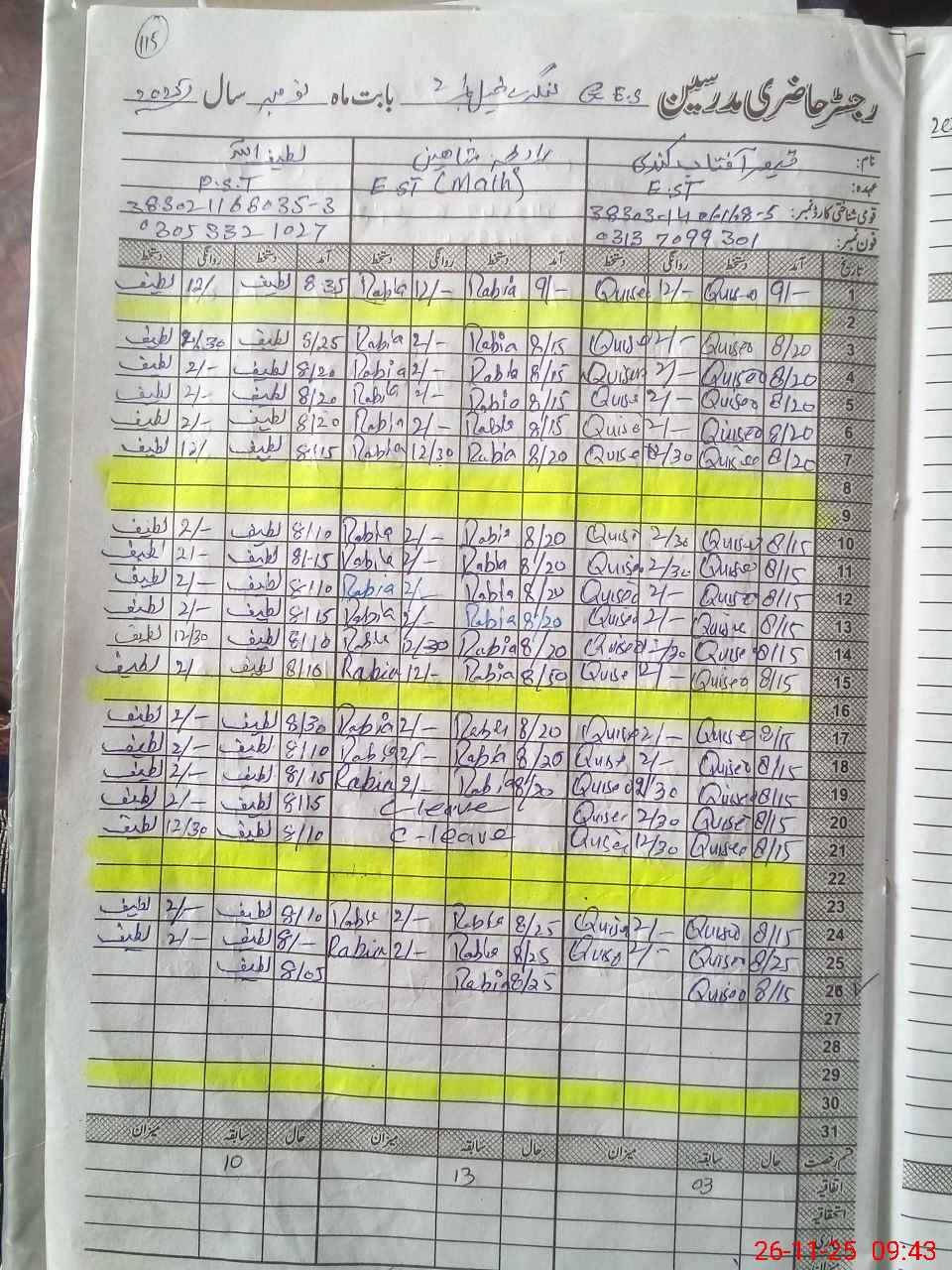 | CNIC | Full Name | Designation | R/C | Absence During Last Calender Month |