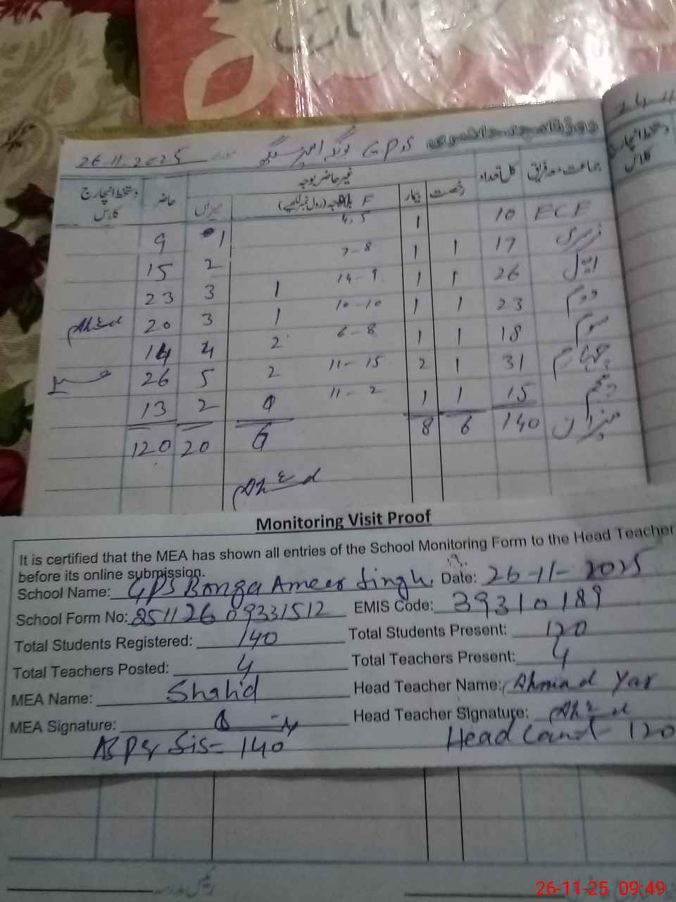| Attendance Register | Head Teacher | MEA with School | Visit Proof |
