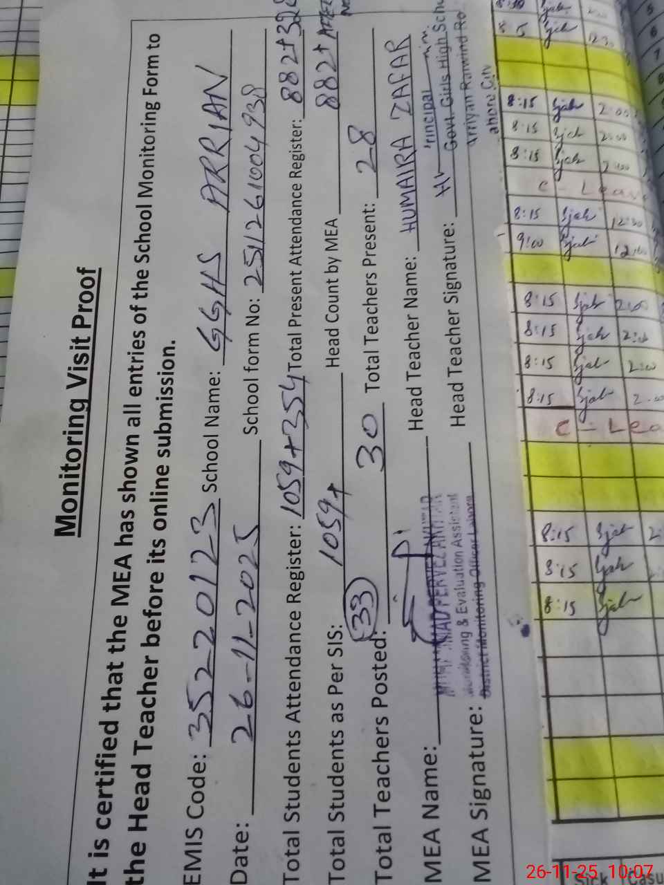 | Monitoring Date: 26-11-2025 | Start Time: 26-11-2025 09:16 AM | End Time: 26-11-2025 10:08 AM | Name of MEA: M.**** AK**** | |