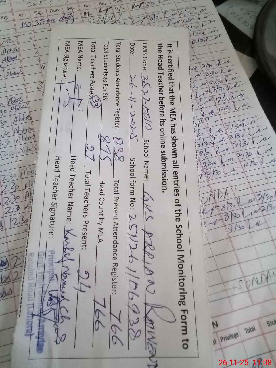 | Attendance Register | Head Teacher | MEA with School | Visit Proof |