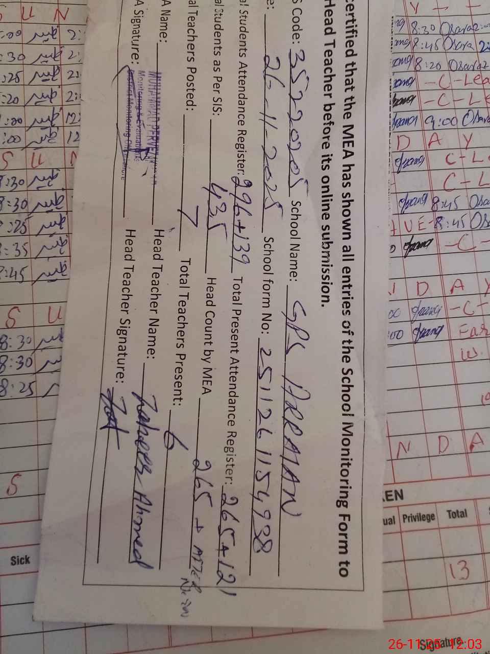 | Attendance Register | Head Teacher | MEA with School | Visit Proof |