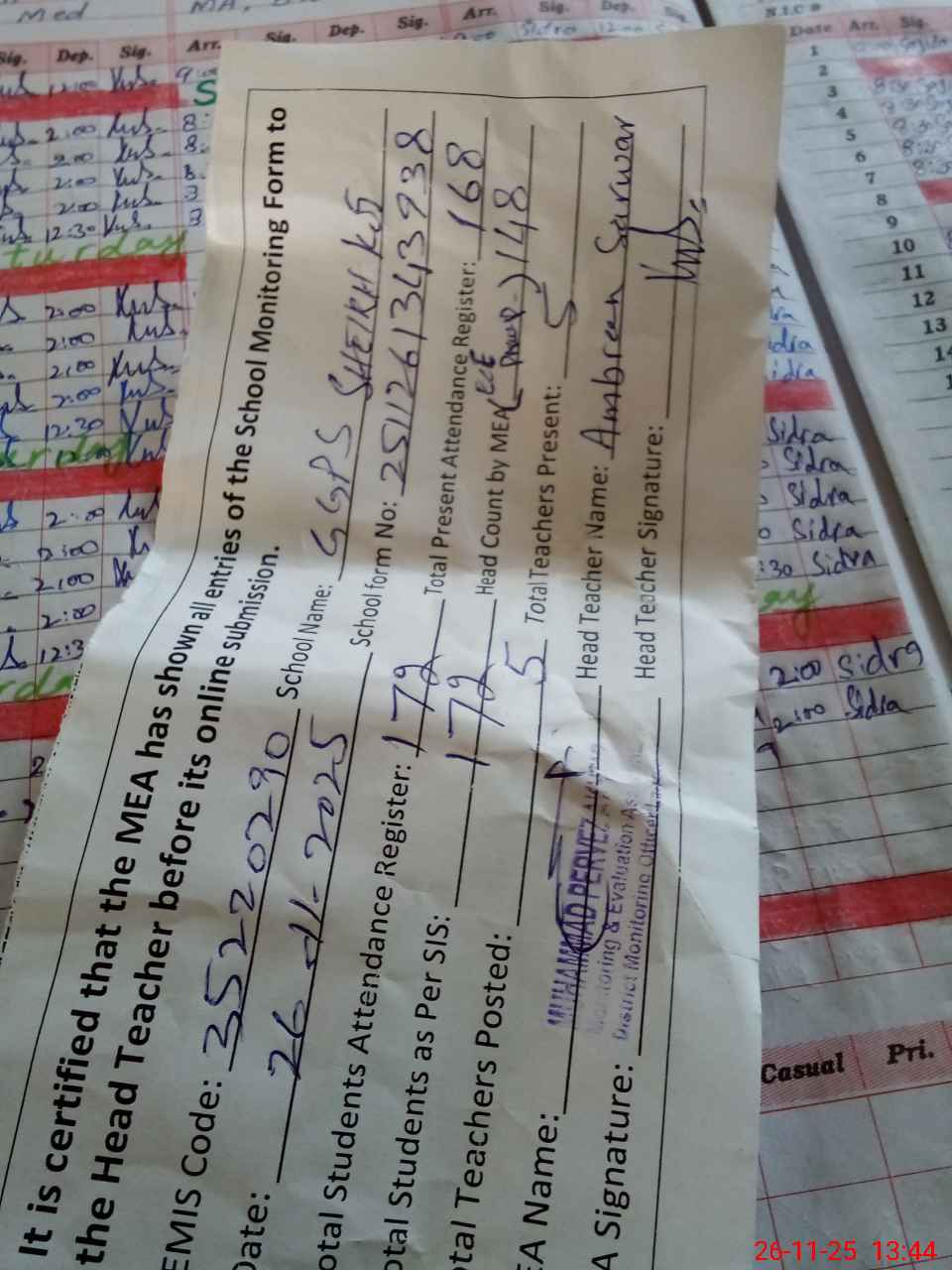 | Attendance Register | Head Teacher | MEA with School | Visit Proof |