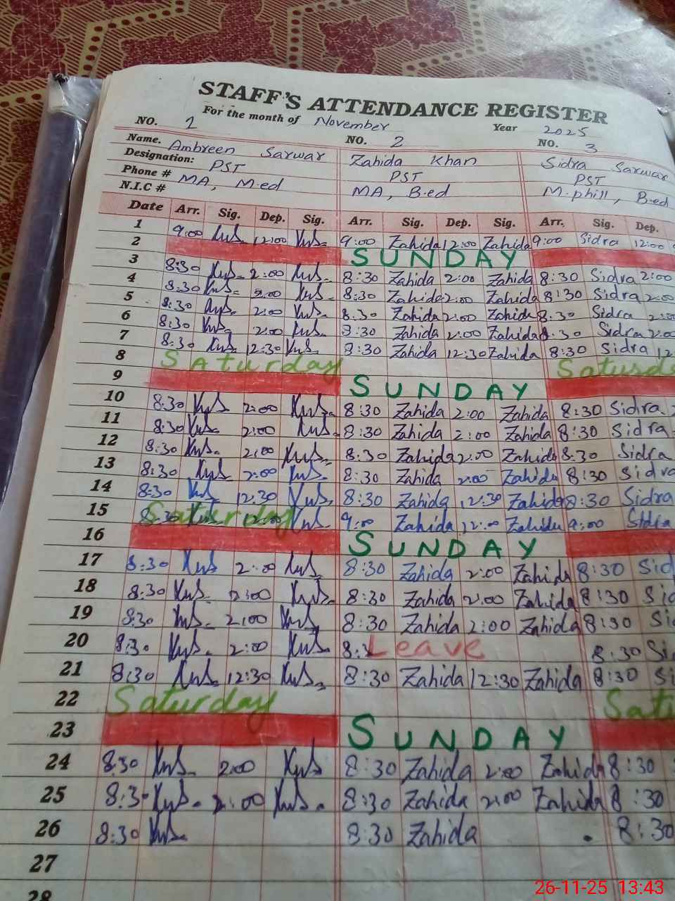 | CNIC | Full Name | Designation | R/C | Absence During Last Calender Month |