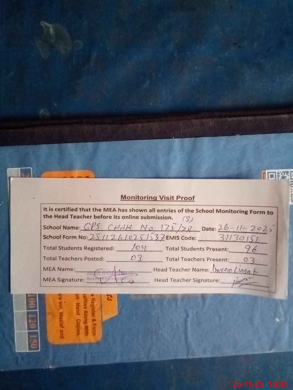 | EMIS Code: 31130151 | Name of School: GPS CHAK NO 175 7R SOUTH | |||