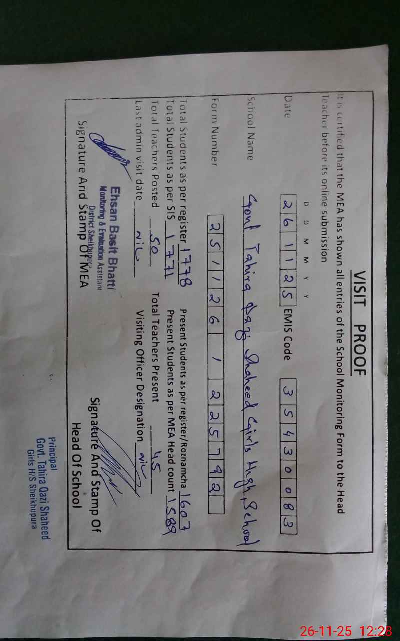 | EMIS Code: 35430083 | Name of School: GOVT. TAHIRA QAZI SHAHEED GIRLS HIGH SCHOOL SHEIKHUPURA | |||
