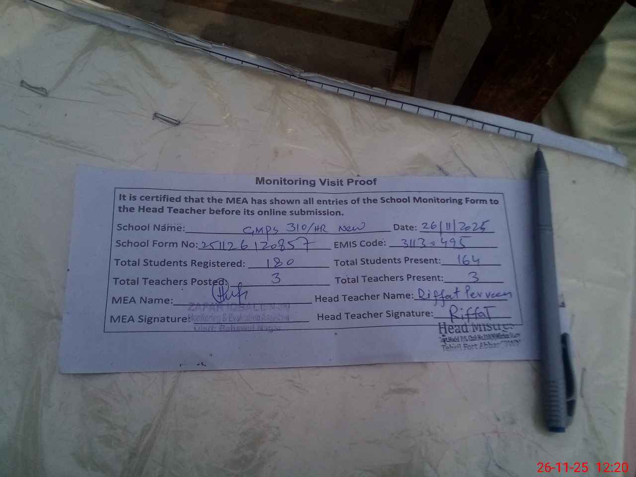 | Attendance Register | Head Teacher | MEA with School | Visit Proof |