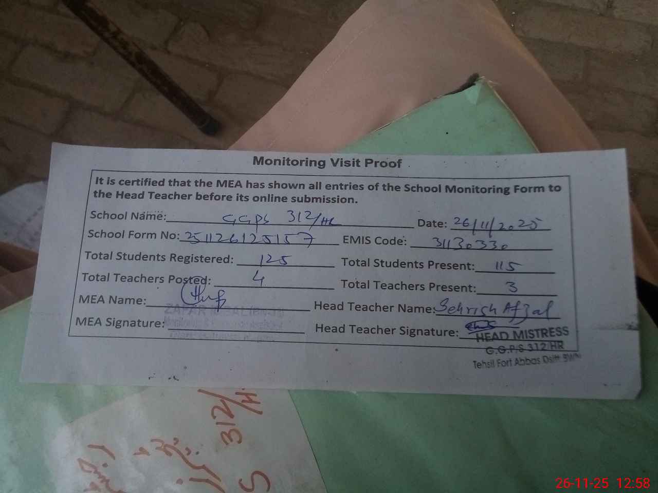 | EMIS Code: 31130330 | Name of School: GGPS CHAK NO. 312 HR | |||