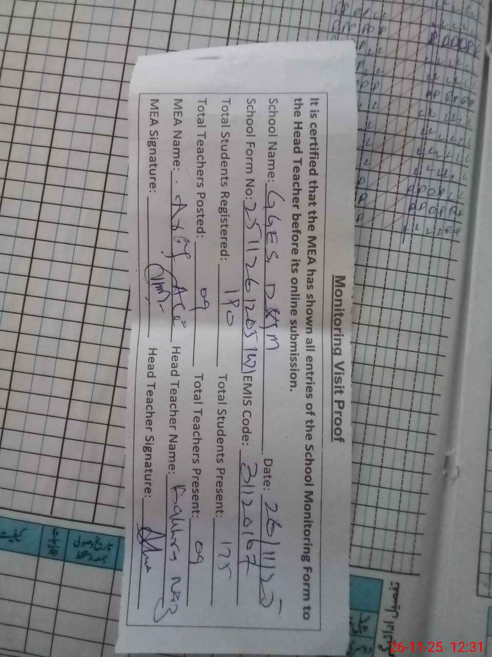 | Attendance Register | Head Teacher | MEA with School | Visit Proof |