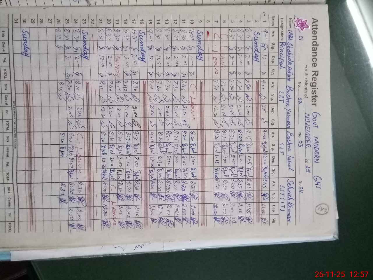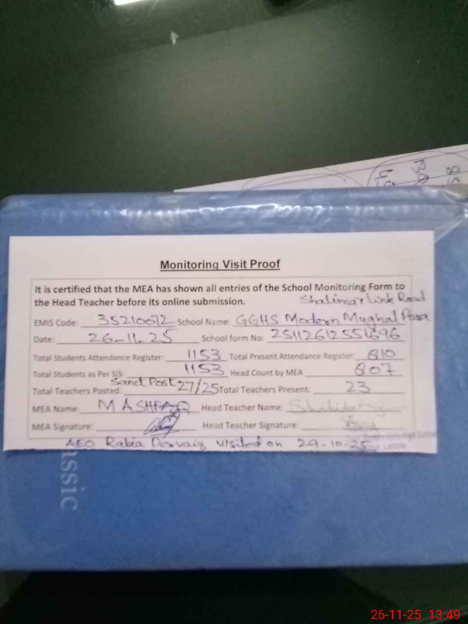 | Remarks (Use Separate Page if Required): Teachers Sanctioned Post 27 and Filled 25 AEO Rabia visited on 29-10-25 EST AT Anam Rasheed and EST Asad Fatima absent today 35210072 | |||||