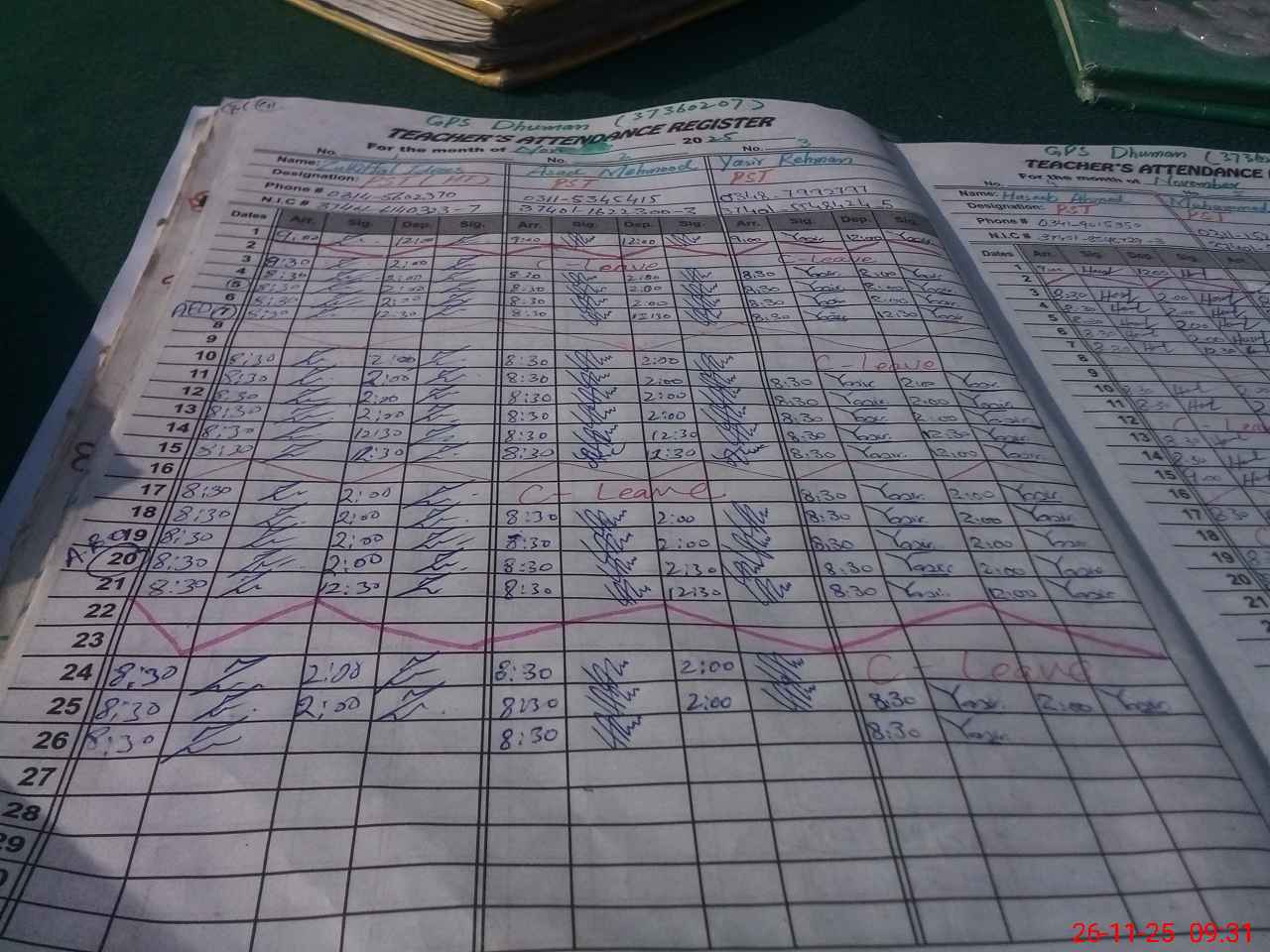 | CNIC | Full Name | Designation | R/C | Absence during last cal. month |