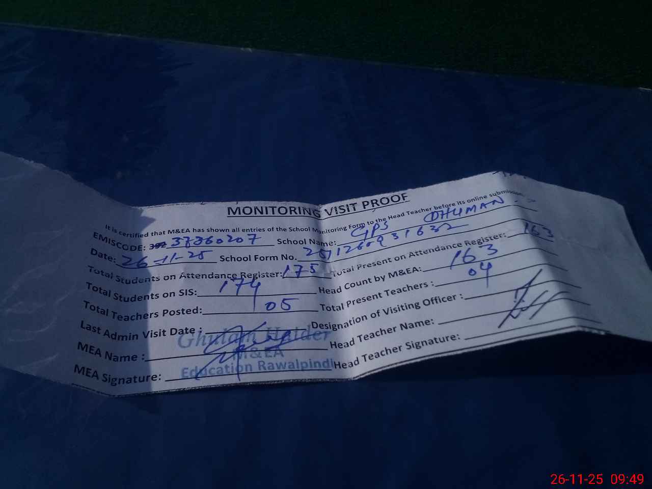 | Attendance Register | Head Teacher | MEA with School | Visit Proof |