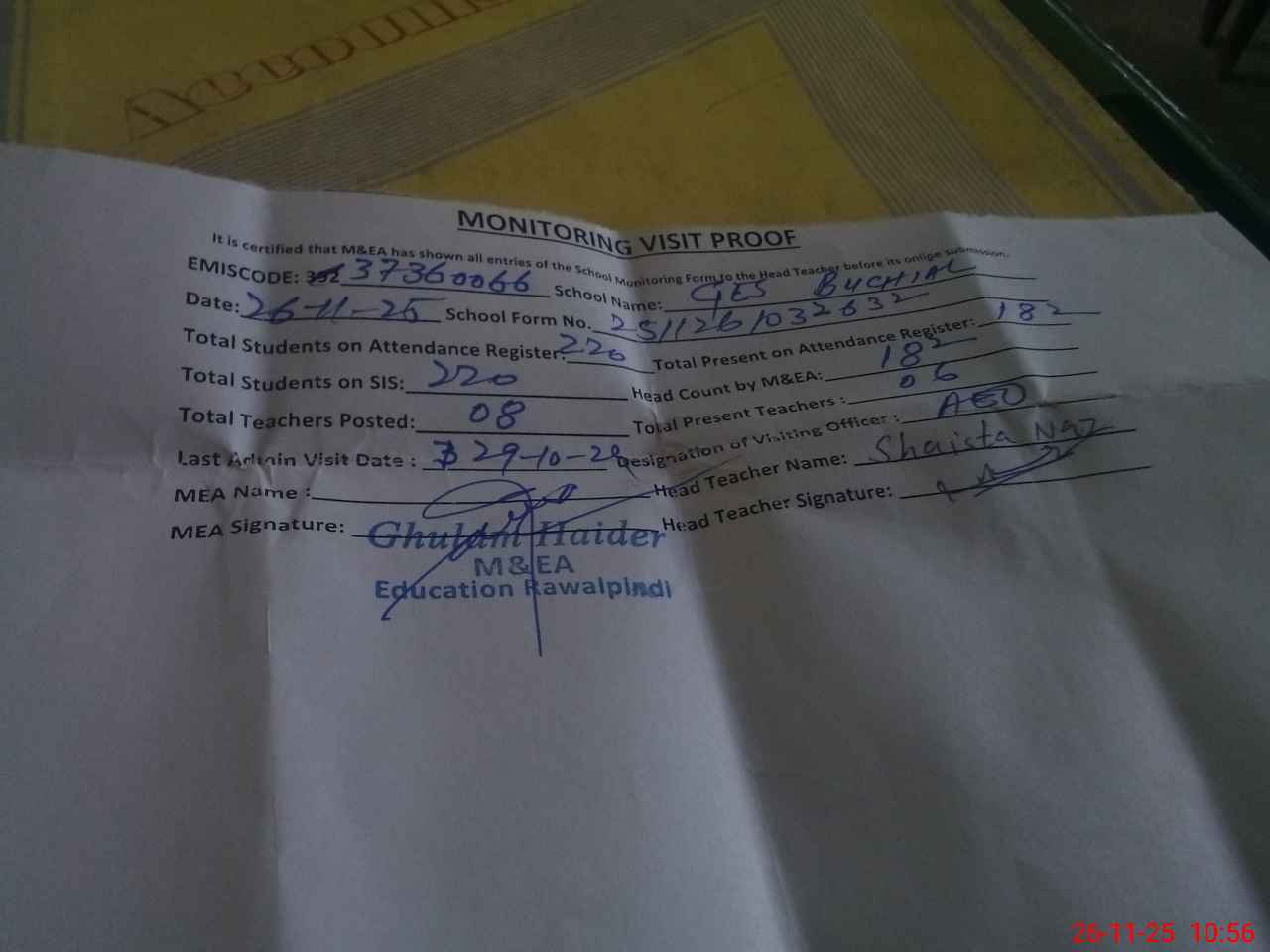 | Attendance Register | Head Teacher | MEA with School | Visit Proof |