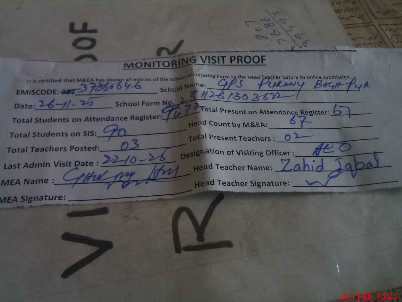 | Attendance Register | Head Teacher | MEA with School | Visit Proof |