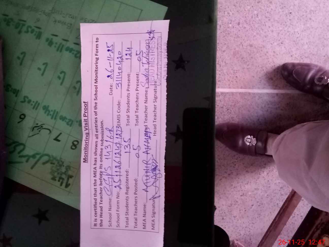 | Attendance Register | Head Teacher | MEA with School | Visit Proof |