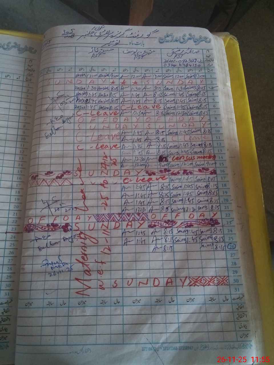 | CNIC | Full Name | Designation | R/C | Absence During Last Calender Month |