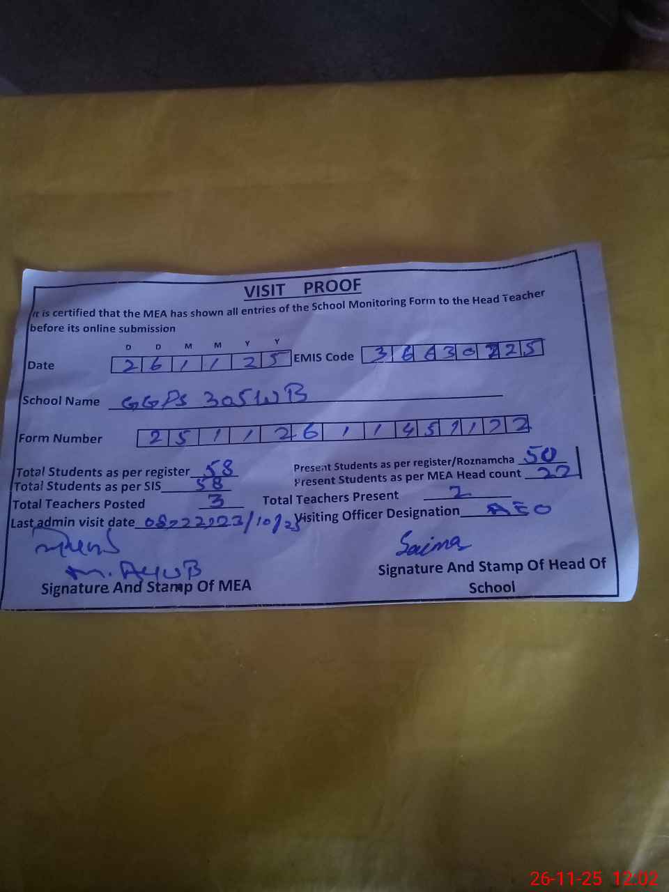 | Attendance Register | Head Teacher | MEA with School | Visit Proof |
