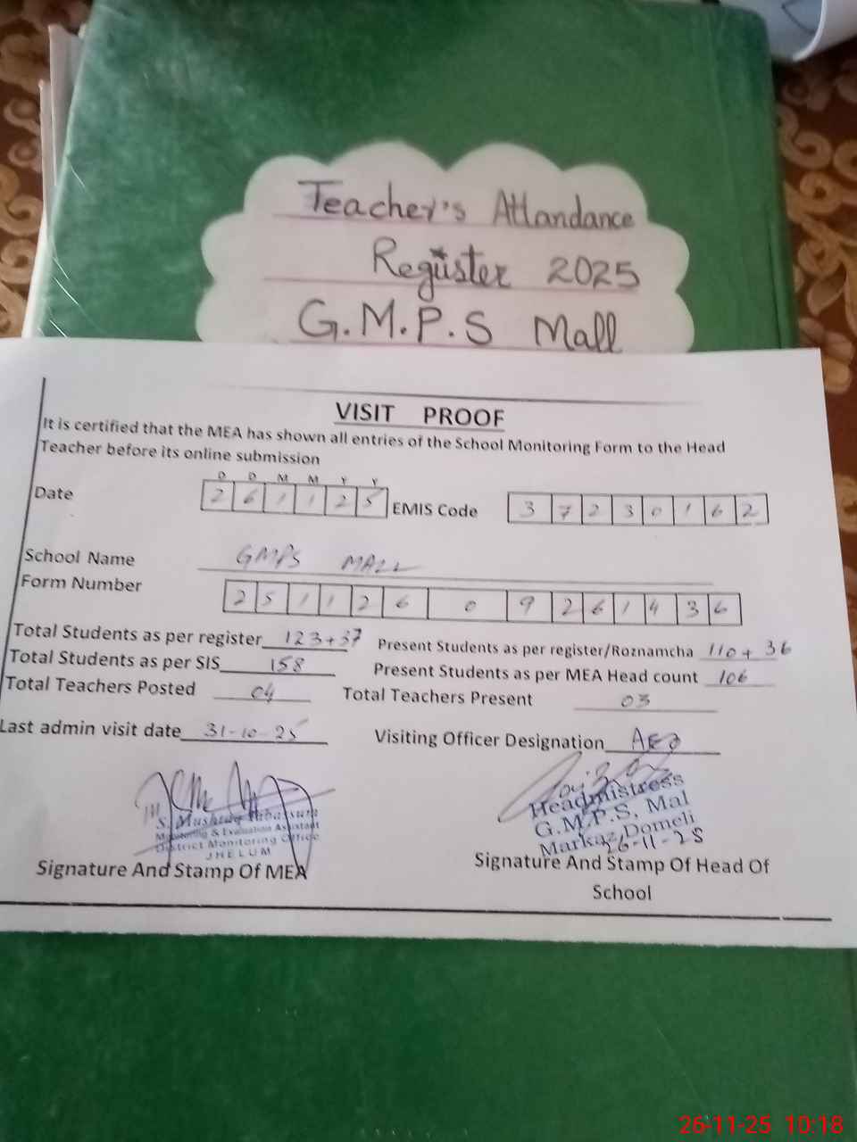 | Attendance Register | Head Teacher | MEA with School | Visit Proof |