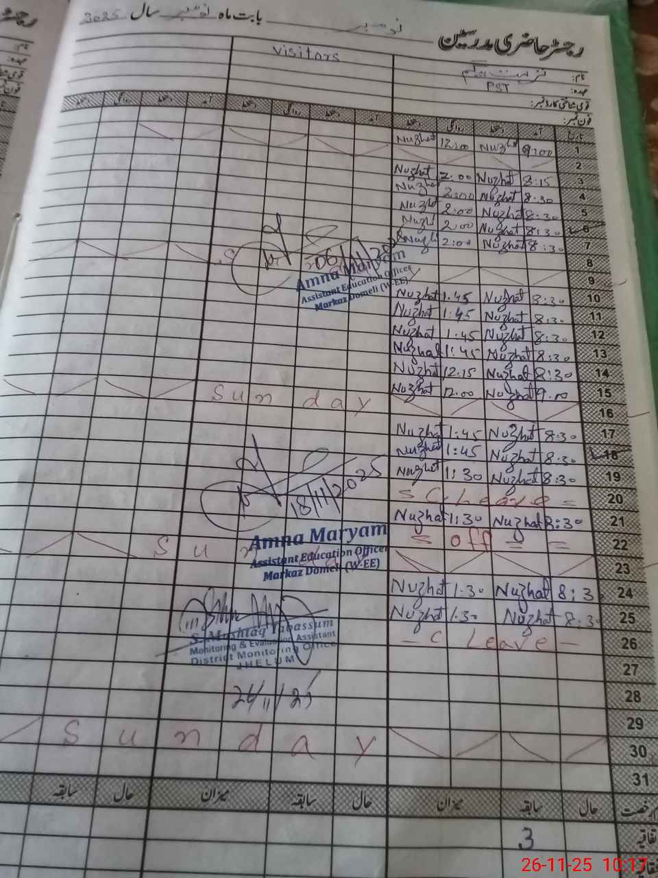 | CNIC | Full Name | Designation | R/C | Absence During Last Calender Month |