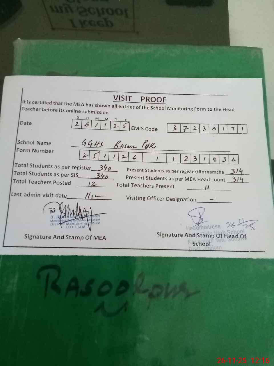 | Attendance Register | Head Teacher | MEA with School | Visit Proof |