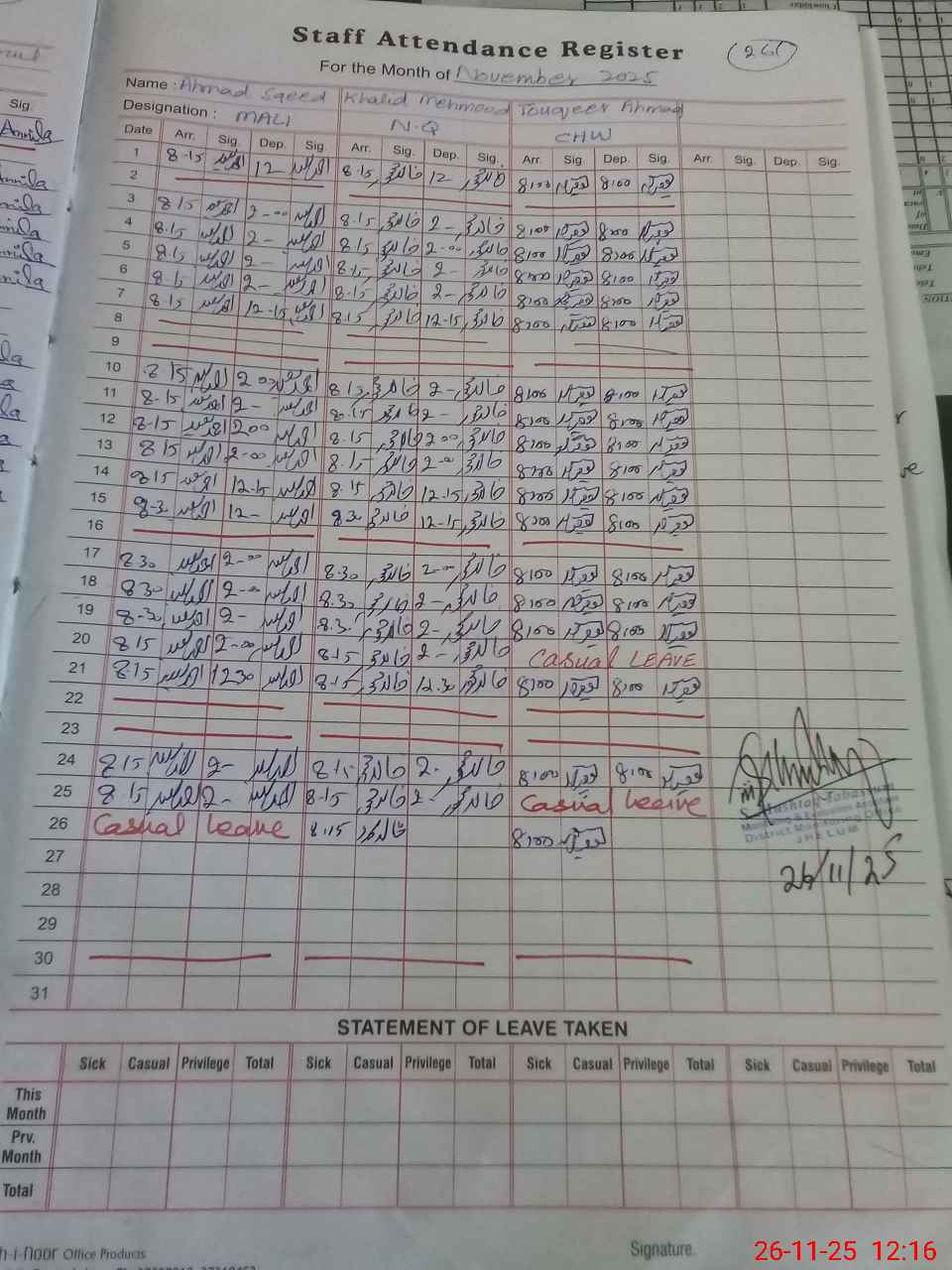| CNIC | Full Name | Designation | R/C | Absence during last cal. month |