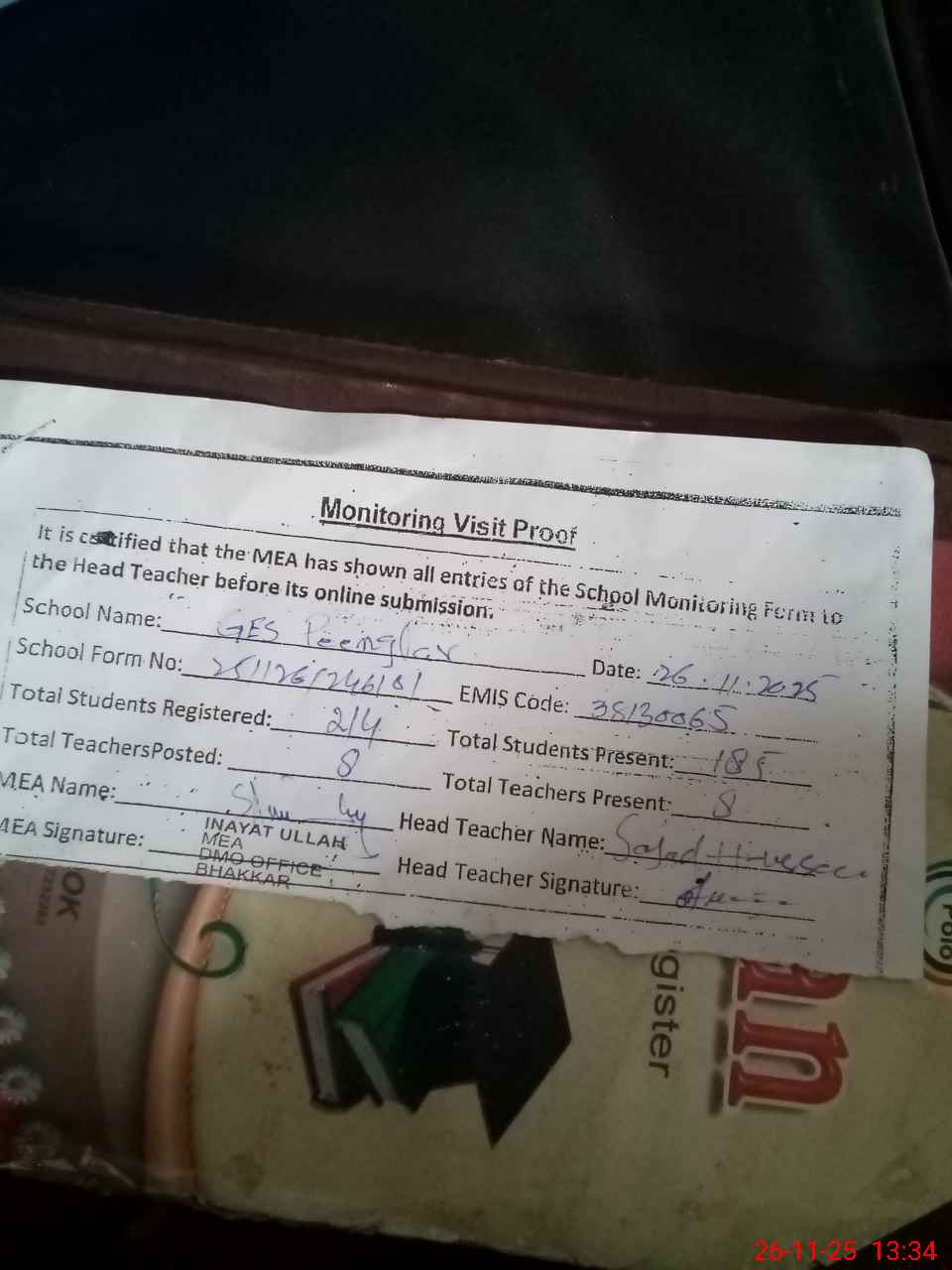 | Attendance Register | Head Teacher | MEA with School | Visit Proof |