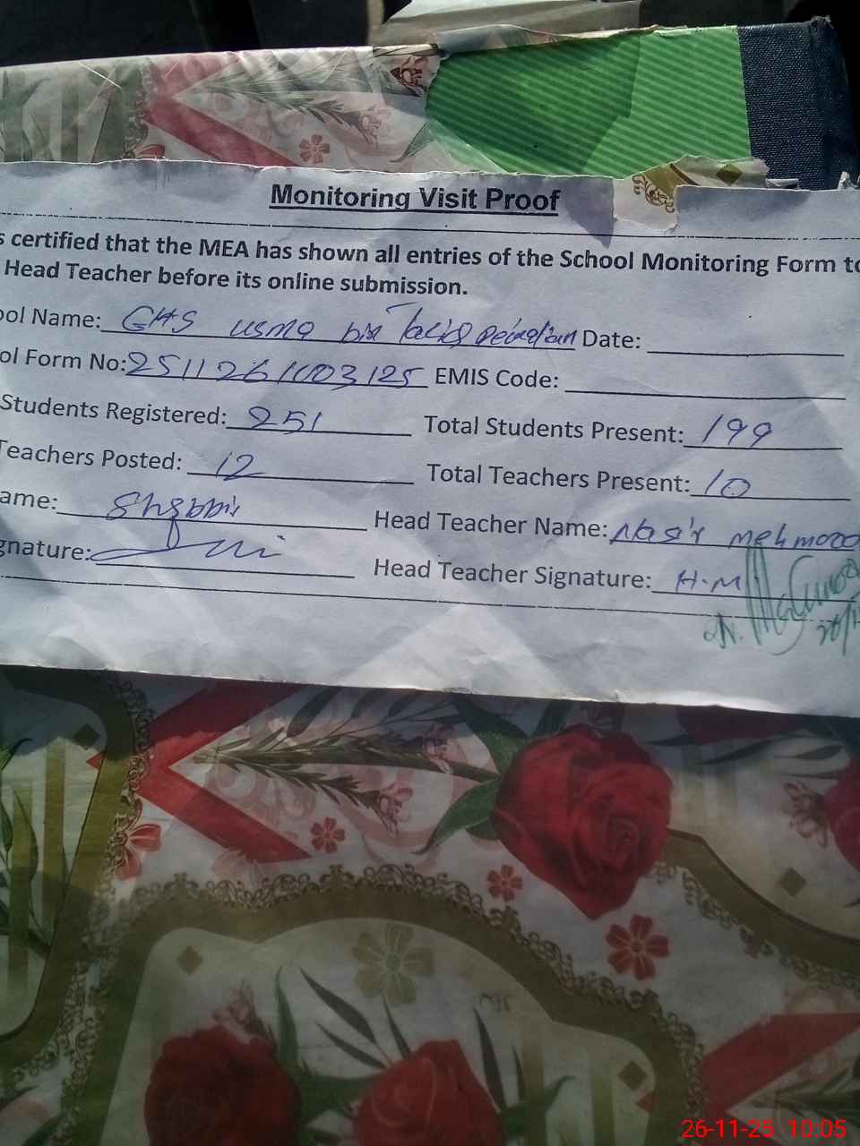 | Attendance Register | Head Teacher | MEA with School | Visit Proof |