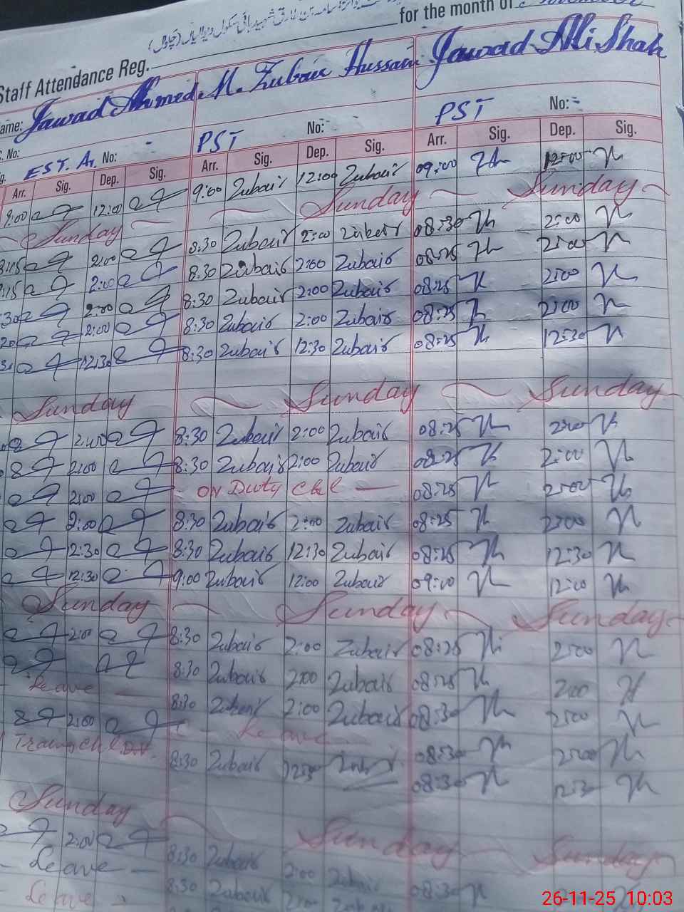 | CNIC | Full Name | Designation | R/C | Absence During Last Calender Month |