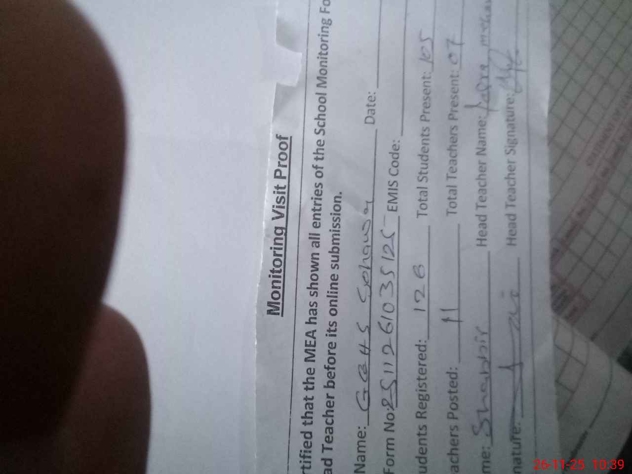 | Attendance Register | Head Teacher | MEA with School | Visit Proof |