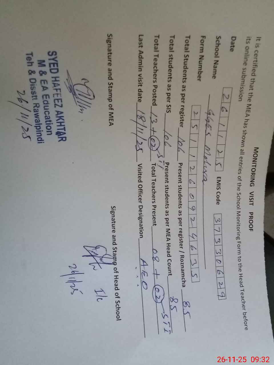 | Monitoring Date: 26-11-2025 | Start Time: 26-11-2025 08:59 AM | End Time: 26-11-2025 09:40 AM | Name of MEA: Sy**** Ha**** Ak**** | |